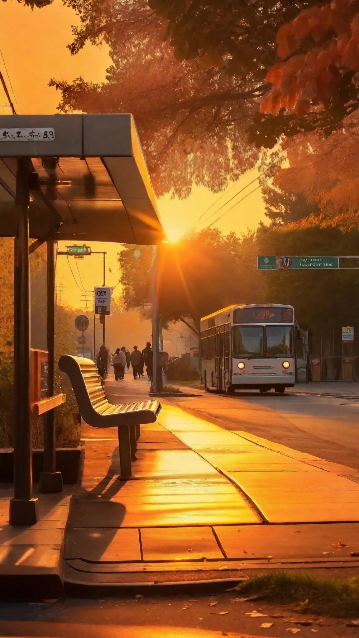 Experience a serene AI-generated sunset cityscape: golden hour glow over an empty bus stop with semi-transparent roof, lush autumn trees shedding leaves onto tiled sidewalks, and soft streetlights. Perfect peaceful dusk scene art with warm orange-red tones. Create this autumn ambiance via Vivago.ai's AI art generator.