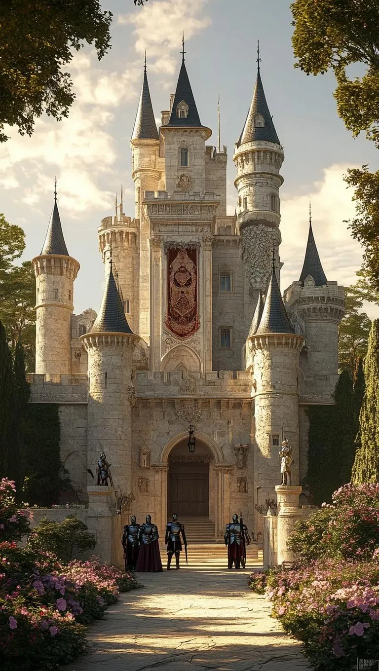 Create a majestic AI-generated limestone and marble castle with medieval tapestries, towering turrets, and armored guards. Surrounded by sprawling gardens, fragrant blooms, and ancient trees, this fantasy fortress embodies grandeur. Perfect for historical visuals or enchanted scenes. Craft breathtaking palaces effortlessly with VivaGo.ai's AI image tools.