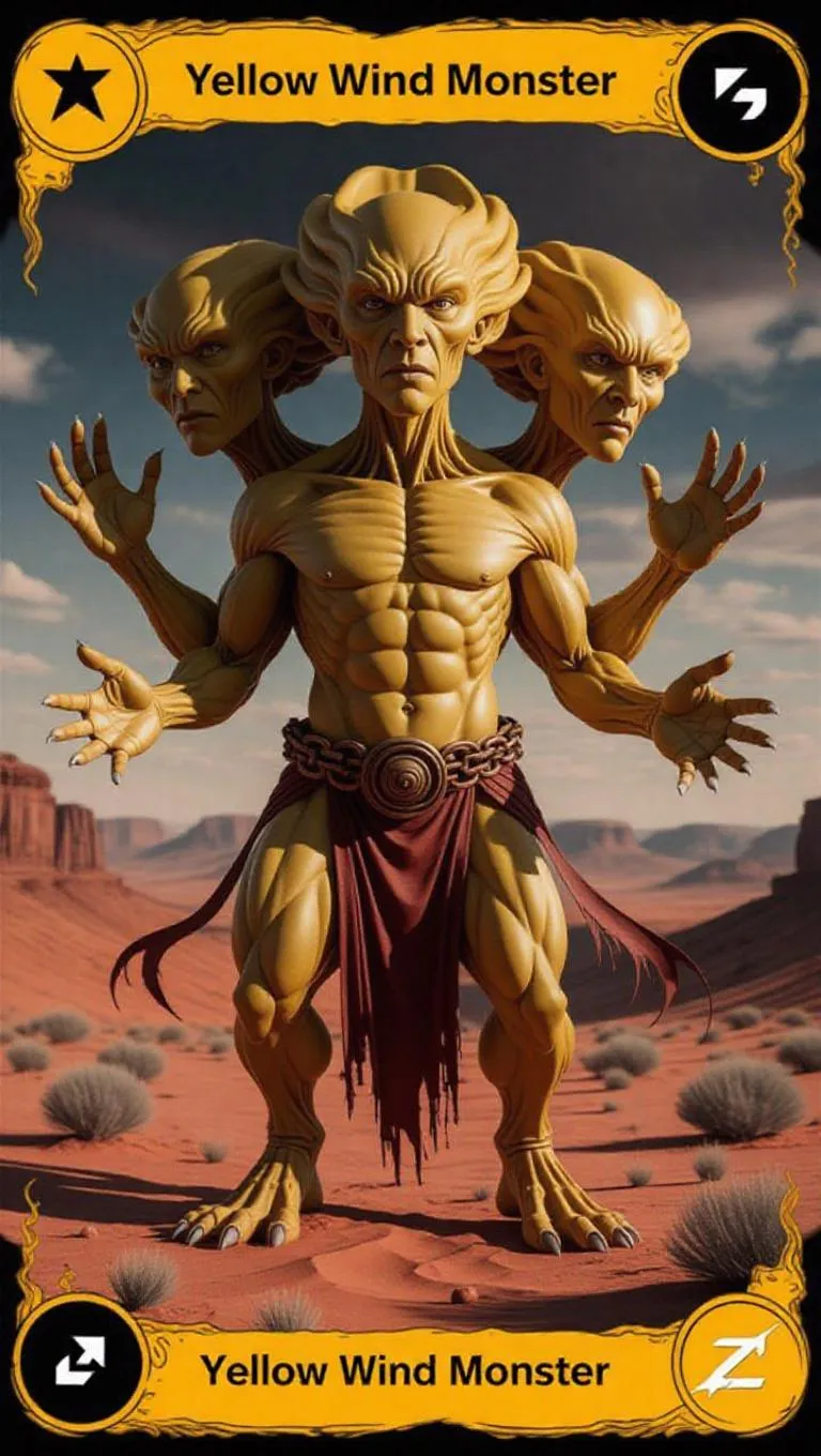 Explore AI-generated "Yellow Wind Demon" card art featuring a three-headed sandstorm deity with swirling tornado palms.敦煌壁画-inspired flowing textures meet bronze chain accessories, rendered in超现实流体雕塑 style using Octane volumetric lighting and RevAnimated model for mythical creature design.