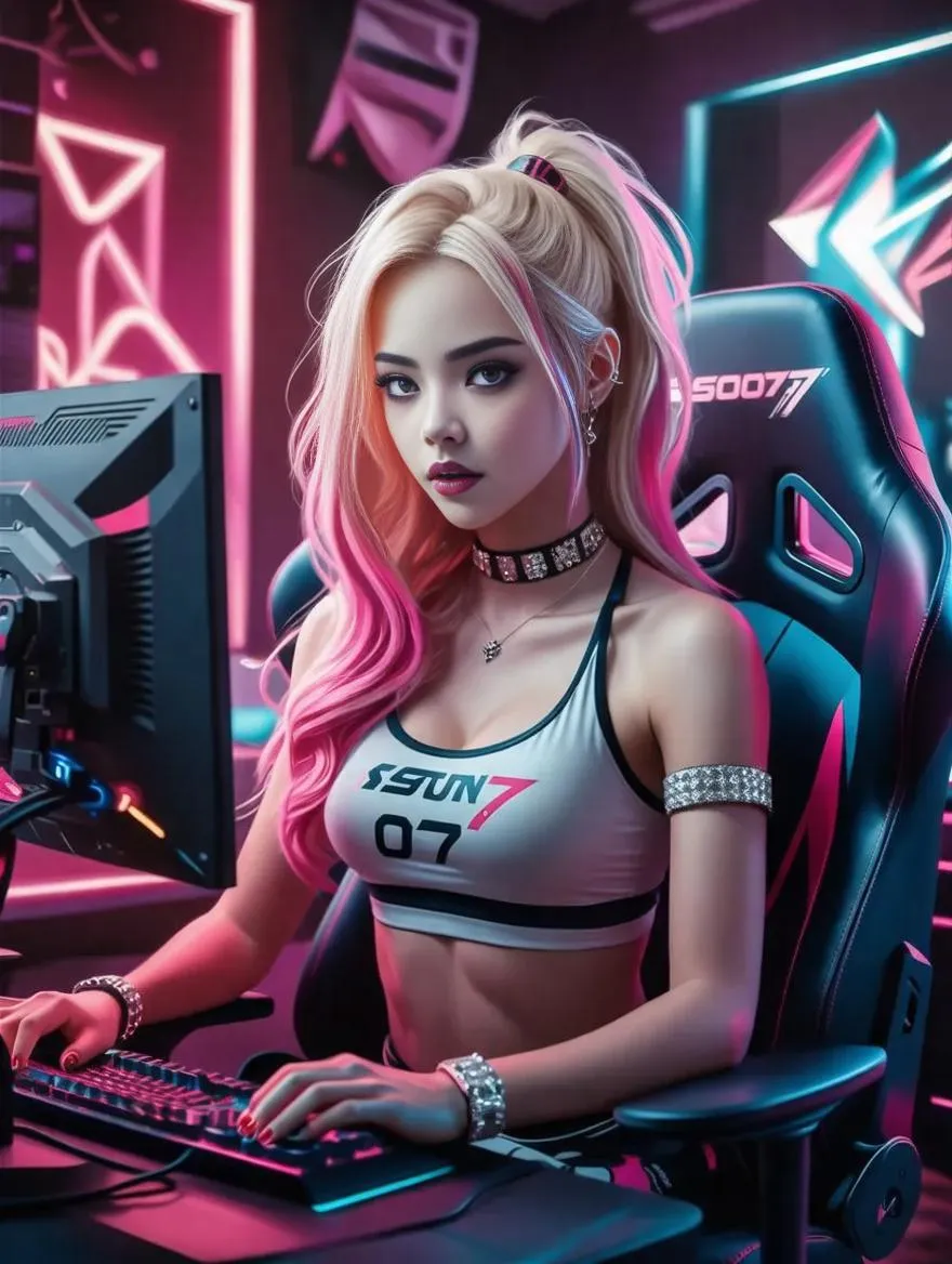 Ultra-realistic AI-generated image of a cyberpunk 2077 gamer girl: vibrant neon gaming setup, dynamic angles, and dramatic lighting. Features a blonde-pink haired streamer with smokey makeup, toned physique, retro Samurai T-shirt, and high-detail cyberpunk bedroom. Perfect for AI art enthusiasts seeking hyper-detailed, vibrant visuals in a futuristic, shallow-depth streaming aesthetic.