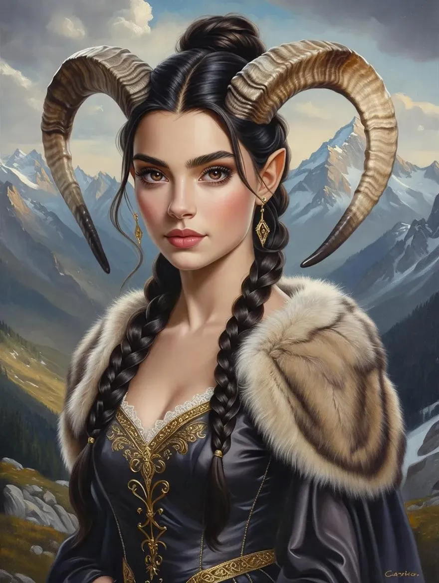 Vivago.ai's AI-generated Capricorn zodiac art depicts a confident woman in a dark blue and gold dress, holding a goat horn atop a mountain. Realistic fantasy style with intricate facial details, fluid lines, and warm vivid hues. Symbolizes strength, wisdom, and determination through serene mountain landscapes and elegant golden accents. Ideal for astrology-themed visuals blending mystical symbolism with lifelike precision.