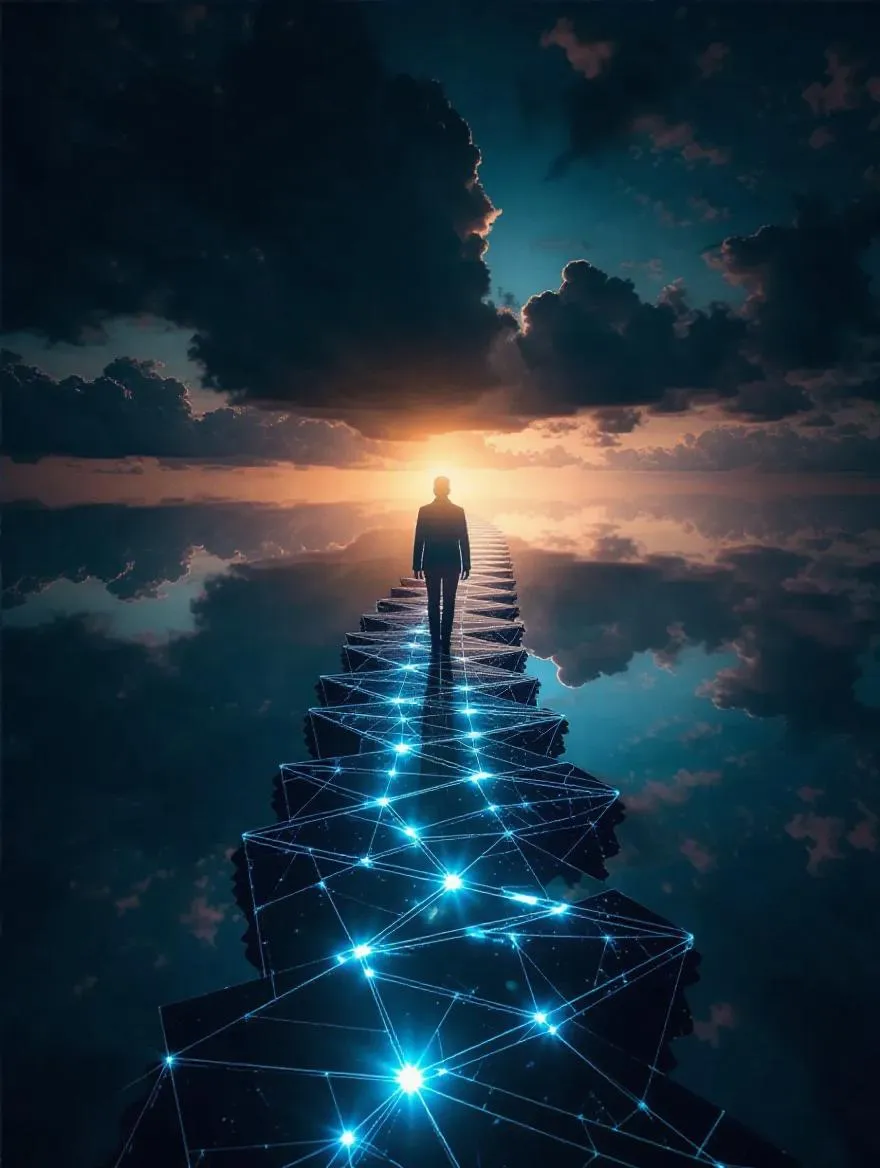 Transform visionary ideas into vivid imagery with vivago.ai. This AI image prompt depicts a person walking a surreal, perilous broken glass path floating skyward – facing a radiant future while darkness looms behind. Generate visually compelling, symbolic art showcasing struggle, hope, and luminous destiny. Turn evocative concepts into professional AI visuals instantly.