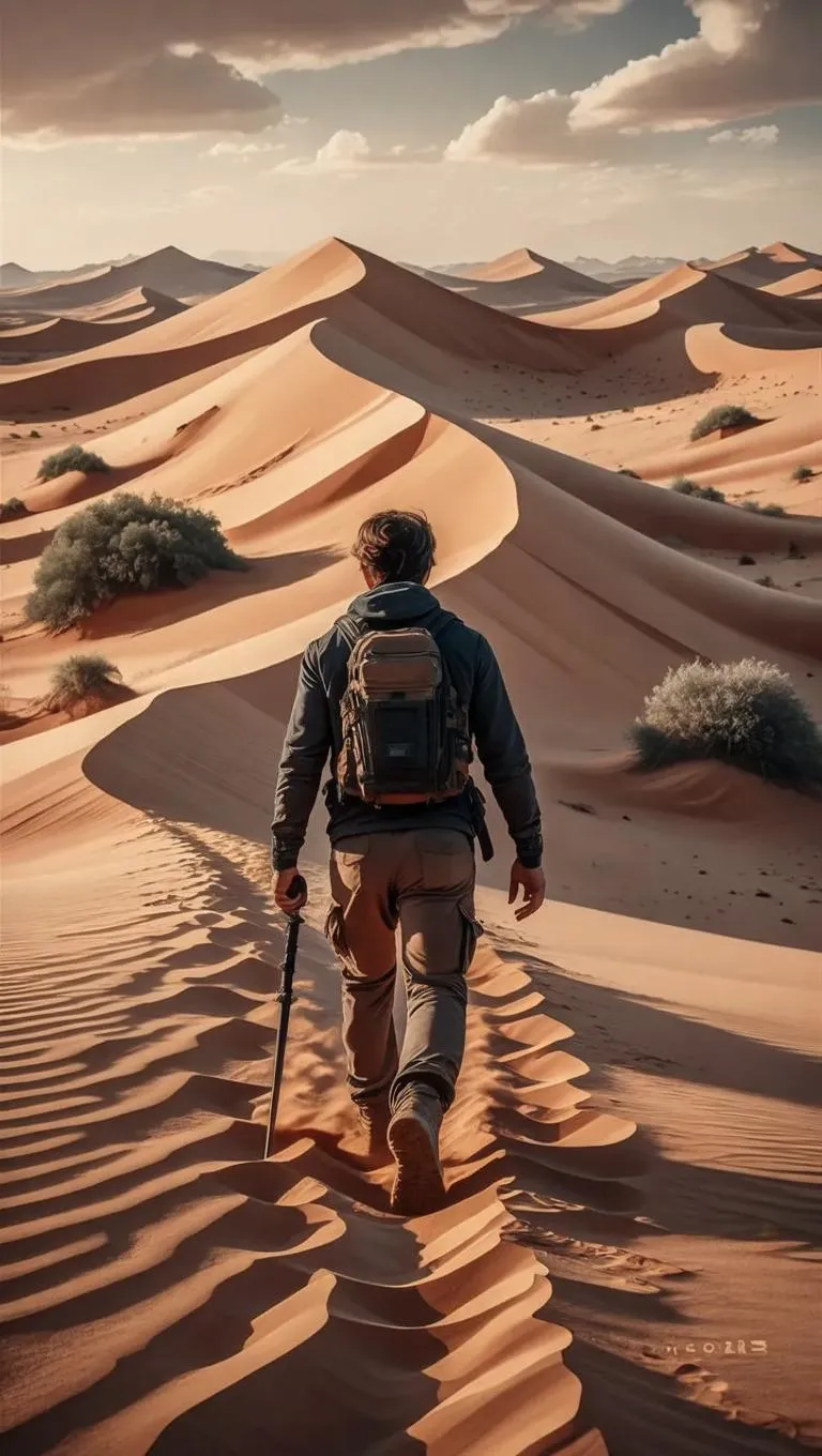 Capture a desert traveler's journey through vast dunes with symbolic footprints, embodying resilience, survival, and pursuit of distant goals. Generate 4K ultra-realistic AI images of arid landscapes, enhancing textures and lighting for lifelike depth. Perfect for visual storytelling, ads, or creative projects. Powered by VivaGo.ai's advanced AI tools for professional-grade, vivid visual content.