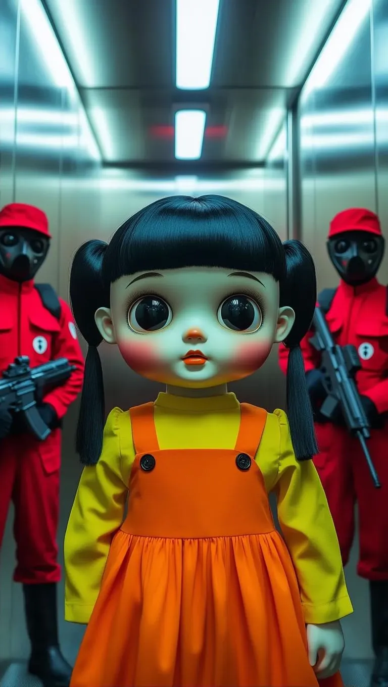 Generate eerie AI visuals of a giant animatronic doll in pigtails and orange dress standing in a metallic elevator, flanked by masked red-jumpsuit guards with rifles. Create tense, horror-inspired scenes using AI effects for professional-grade imagery. Perfect for crafting unnerving atmospheres with fluorescent lighting and dystopian details through AI-driven creative tools.