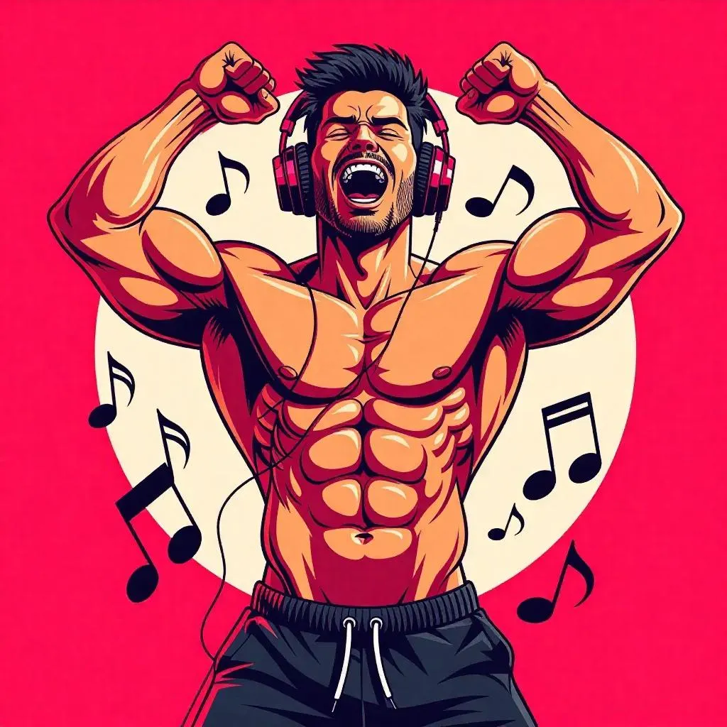 Create vibrant cartoon visuals of a strong shirtless man wearing headphones, surrounded by bouncing music notes. Generate this dynamic AI art instantly with vivago.ai's powerful creative tools. Transform your prompts into professional, eye-catching images effortlessly.