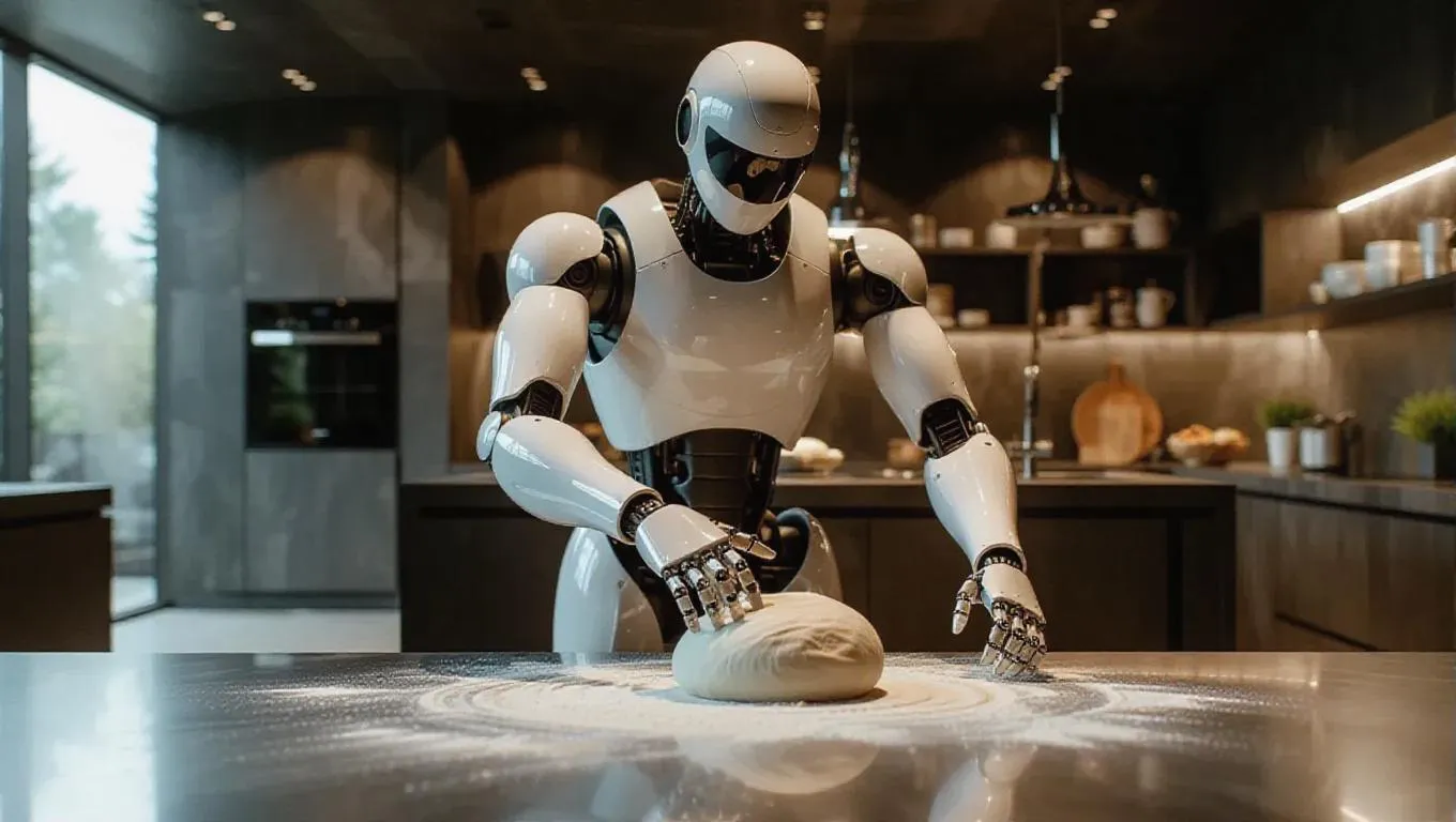 Generate dynamic AI visuals of a multitasking tall robot swiftly kneading bread and cleaning in a vast kitchen. Elevate creativity with vivago.ai's professional AI tools for lifelike, action-packed scene generation.
