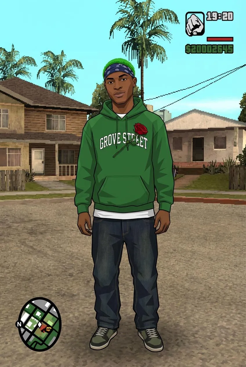 Transform your photos into GTA San Andreas nostalgia with this AI effect. Get the iconic Grove Street clothes color scheme, change hair to vibrant green, and keep the classic bandana. Create authentic retro gaming visuals instantly using vivago.ai's powerful AI image generator.
