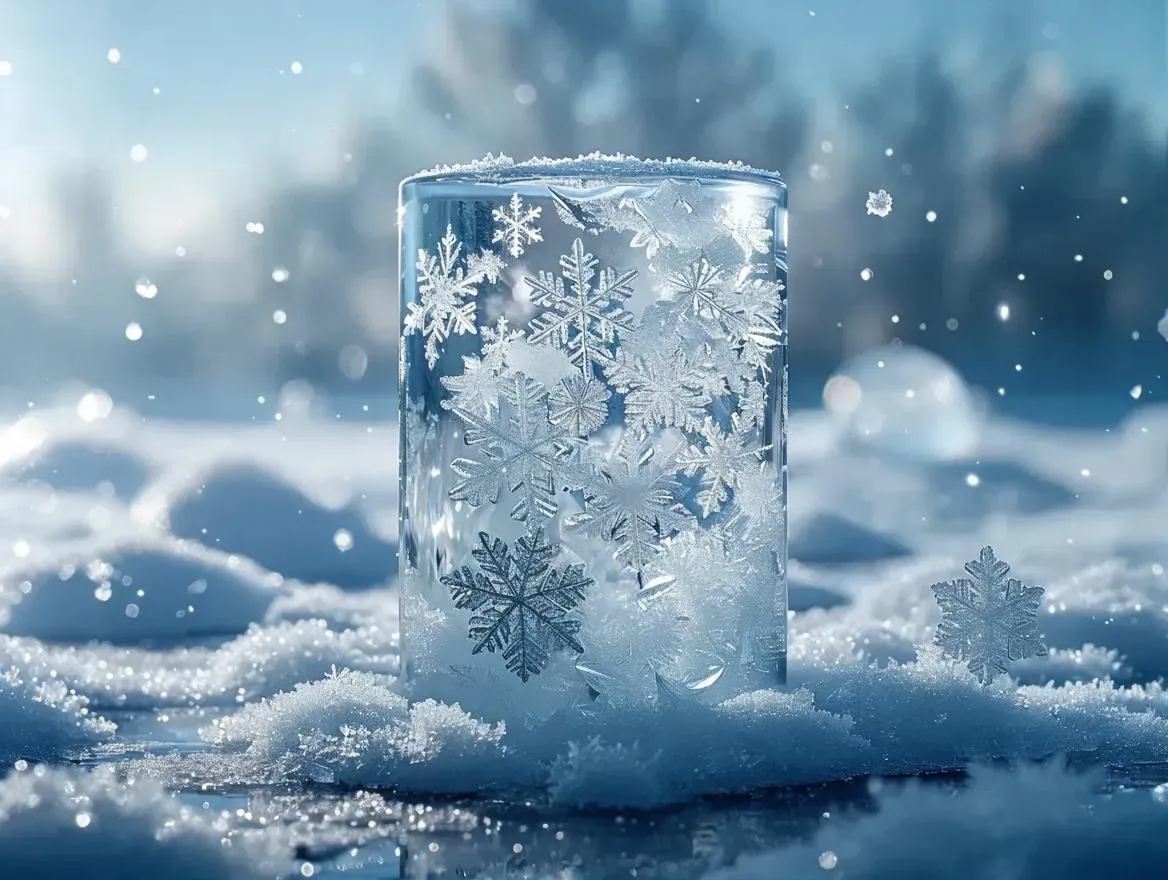 Generate an AI ice cylinder with intricate snowflakes and glowing orbs inside, crafted using advanced image generation. Achieve a frosted glass effect with realistic textures and luminous details. Perfect for winter-themed visuals, this AI-powered design offers seamless editing and a pristine, minimalist background for professional creative projects.