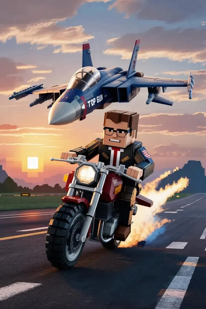 Minecraft-style voxel art recreating Top Gun's iconic moment: Maverick rides a blocky motorcycle chasing a voxelized F/A-18 Super Hornet on a pixelated airfield. Vibrant cubical sunrise backdrop, blocky leather jacket, and aviator glasses capture the film's thrill in playful Minecraft aesthetics. Perfect blend of nostalgia, high-speed action, and retro pixel art for gaming and movie fans.
