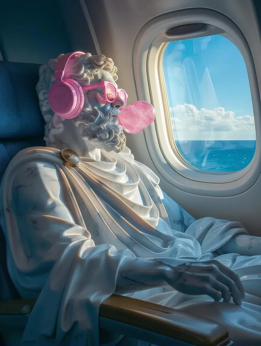 Transform text to stunning visuals with vivago.ai. Craft an AI image of a Greek Zeus statue in an airplane first-class seat: smooth marble skin, flowing robe, pink headphones and glasses. Blowing bubbles, gazing at sea views through a window against a blue sky. Natural light, solitude emphasized. No humans. Generate effortlessly.