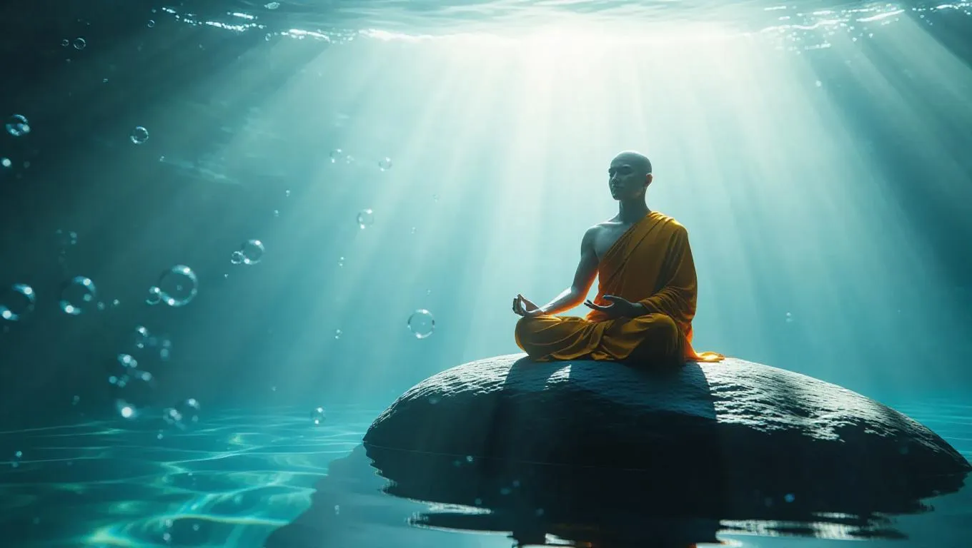 15. An ethereal underwater meditation scene with a serene monk seated cross-legged on a smooth rock, surrounded by shimmering bubbles and radiant light rays illuminating the water, creating a tranquil and mystical atmosphere.