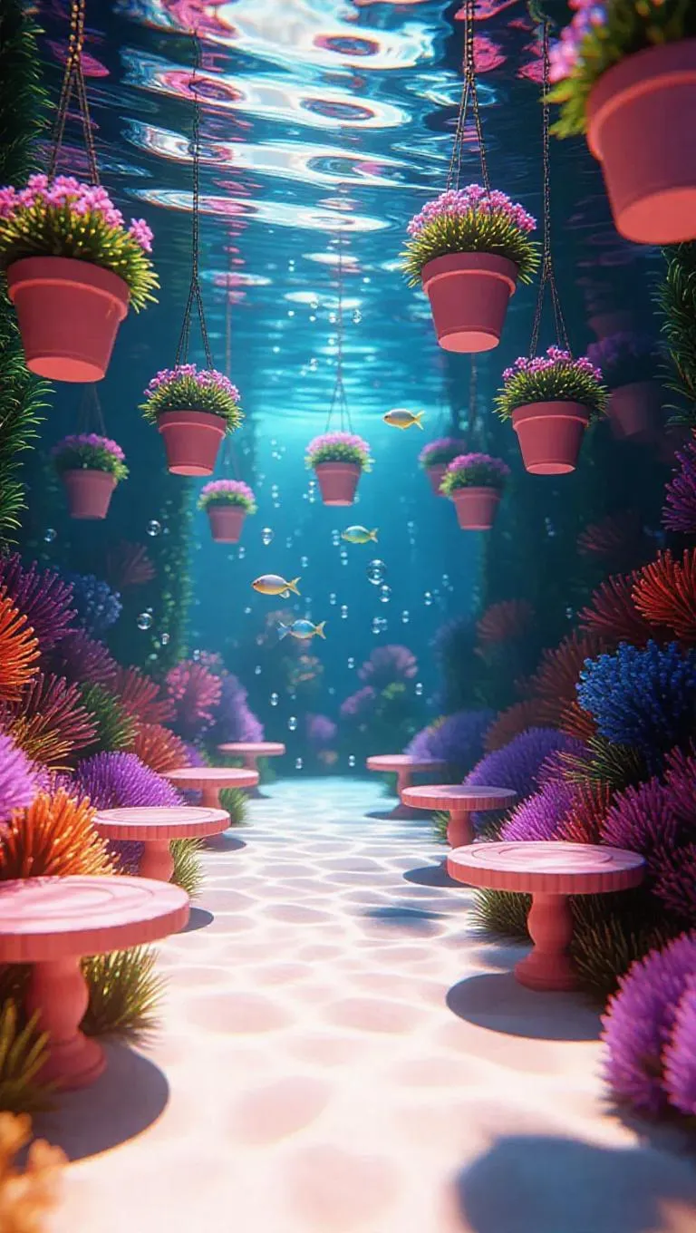 Surreal underwater garden party, floating flower pots and benches, dreamlike colors, weightless atmosphere, ethereal bubbles, soft glowing lights, vibrant coral backdrop, serene and whimsical, surrounded by gentle sea currents, iridescent fish darting around.