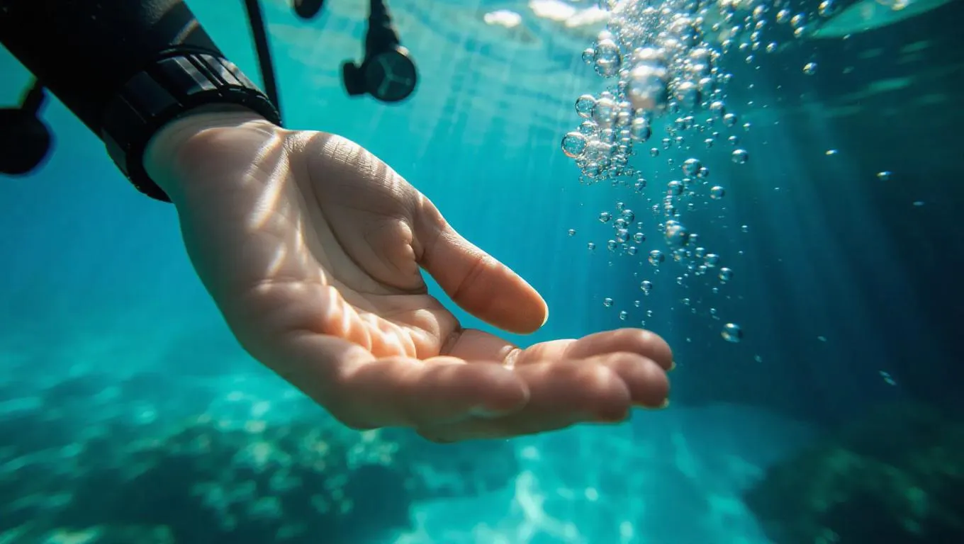 Underwater photography style, intimate close-up of a diver's hand reaching out, capturing the play of light on skin and bubbles, surrounded by a serene blue backdrop, with subtle light rays piercing through, enhancing the ethereal atmosphere.