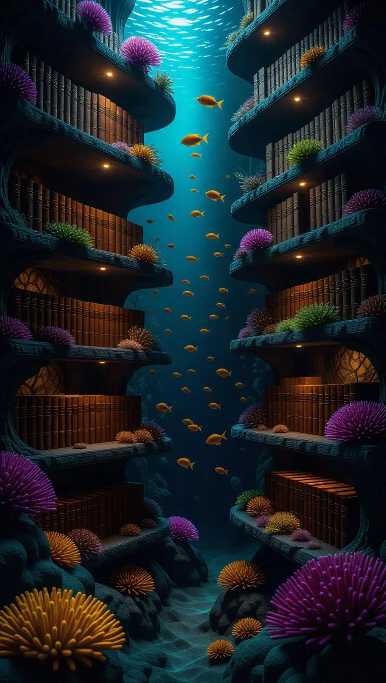 Fantasy underwater library intricately carved into vibrant coral reef walls, floating bookcases emit a soft, ethereal glow, twilight lighting creates a dreamy atmosphere, surrounded by gentle currents and golden fish.