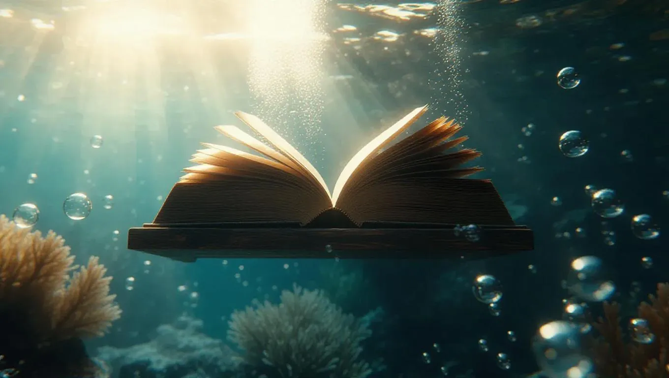 A floating grimoire shelf underwater, ancient and mysterious grimoires opening and closing like ethereal spirits, surrounded by underwater photographers and shimmering bubbles, casting an otherworldly glow, creating a mystical and enchanting atmosphere.