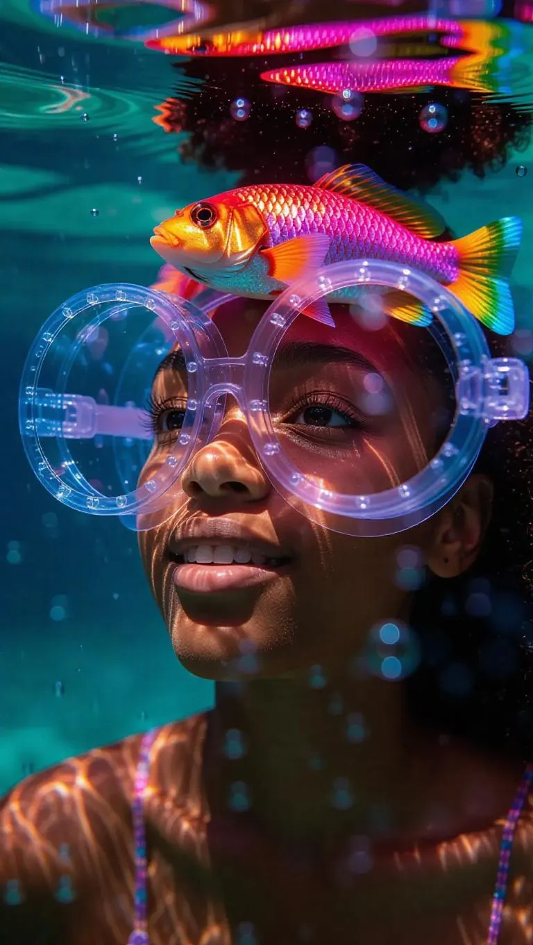 Macro underwater scene of girl wearing fish-shaped bubble helmet, rainbow refractions through colored membranes, joyful expression, soft focus foreground, glowing hydrozoans riding spiral currents, ethereal bioluminescent flora, gentle water ripples, light hues.