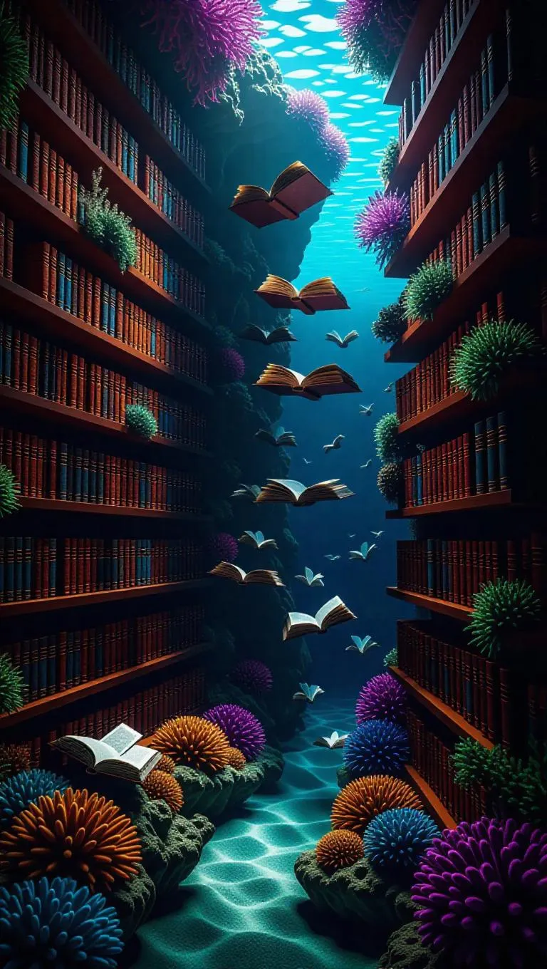 Fantasy underwater library intricately carved into vibrant coral reef walls, floating books emit a soft, ethereal glow, dreamlike lighting creates a mystical atmosphere, surrounded by gentle currents and colorful marine life.
