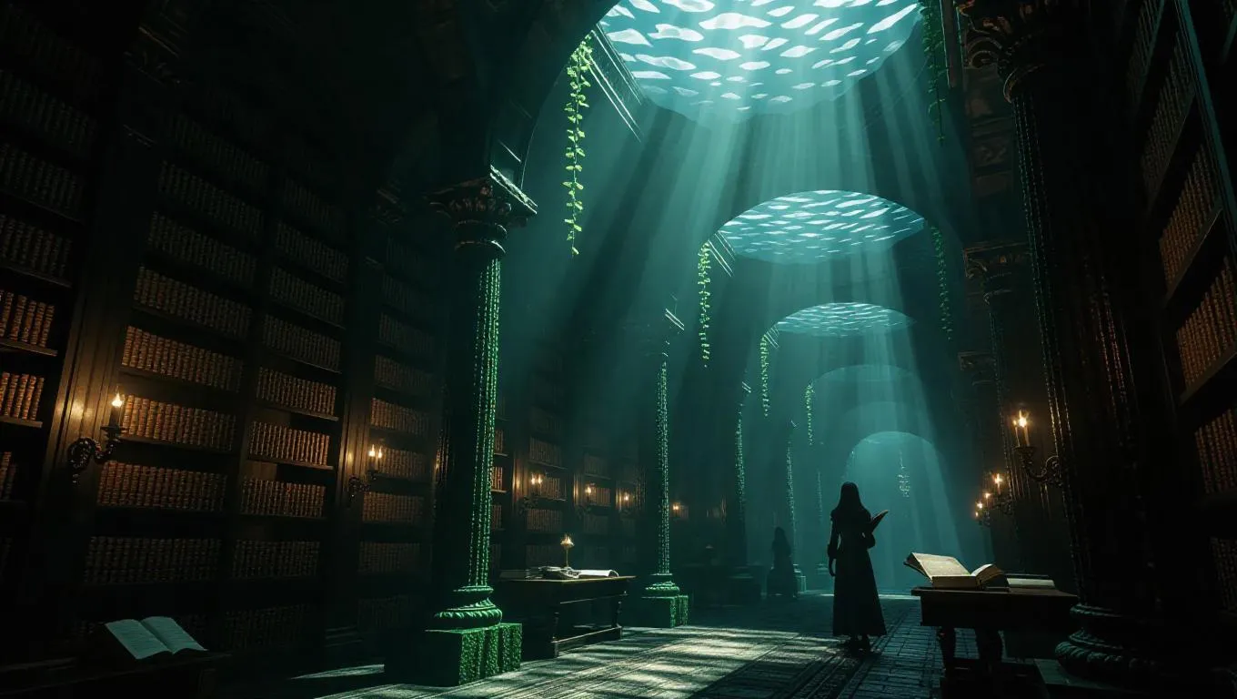 A grand underwater library with woven seaweed columns, where scrolls hover in the tranquil flow. Silver light filters from the surface above, creating sparkling reflections on pensive merfolk scholars.