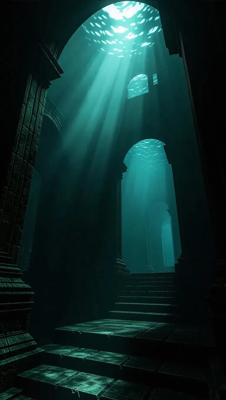 A dystopian underwater ruins of a once-great city, with dilapidated stone remains blanketed in dark algae and fire, illuminated by shafts of sunlight filtering through the dense water, creating an eerie and captivating atmosphere.