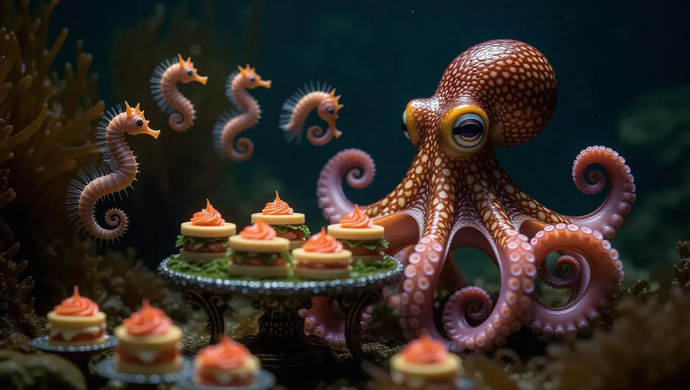 A whimsical underwater picnic scene where a vibrant octopus sits at a small, ornate table covered with seaweed sandwiches and coral cakes. A school of tiny shrimp swims by, intrigued by the unusual setup, while elegant seahorses serve as attentive waiters.