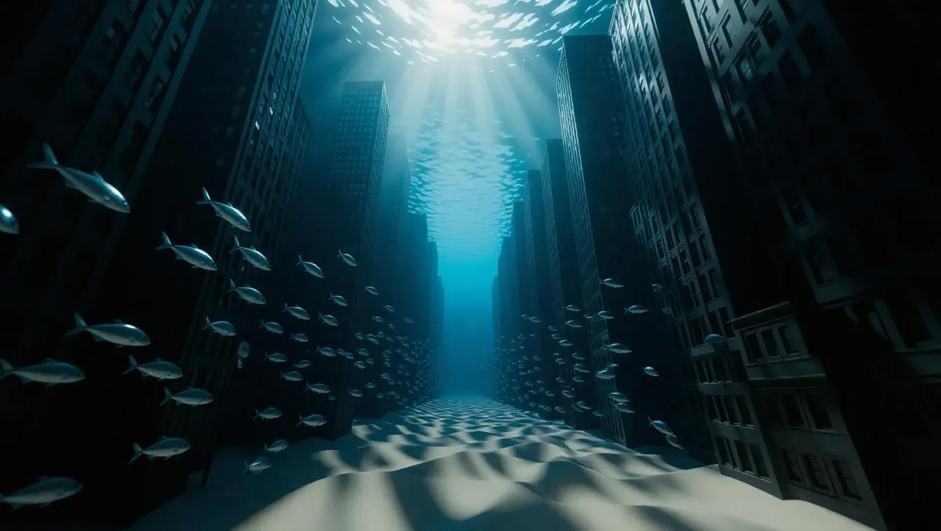 A cityscape scene underwater, submerged skyscrapers and streets, shafts of light filtering through sandy particles, creating a haunting play of light and shadow, cinematic lighting, highly detailed, surrounded by schools of shimmering silver fish.