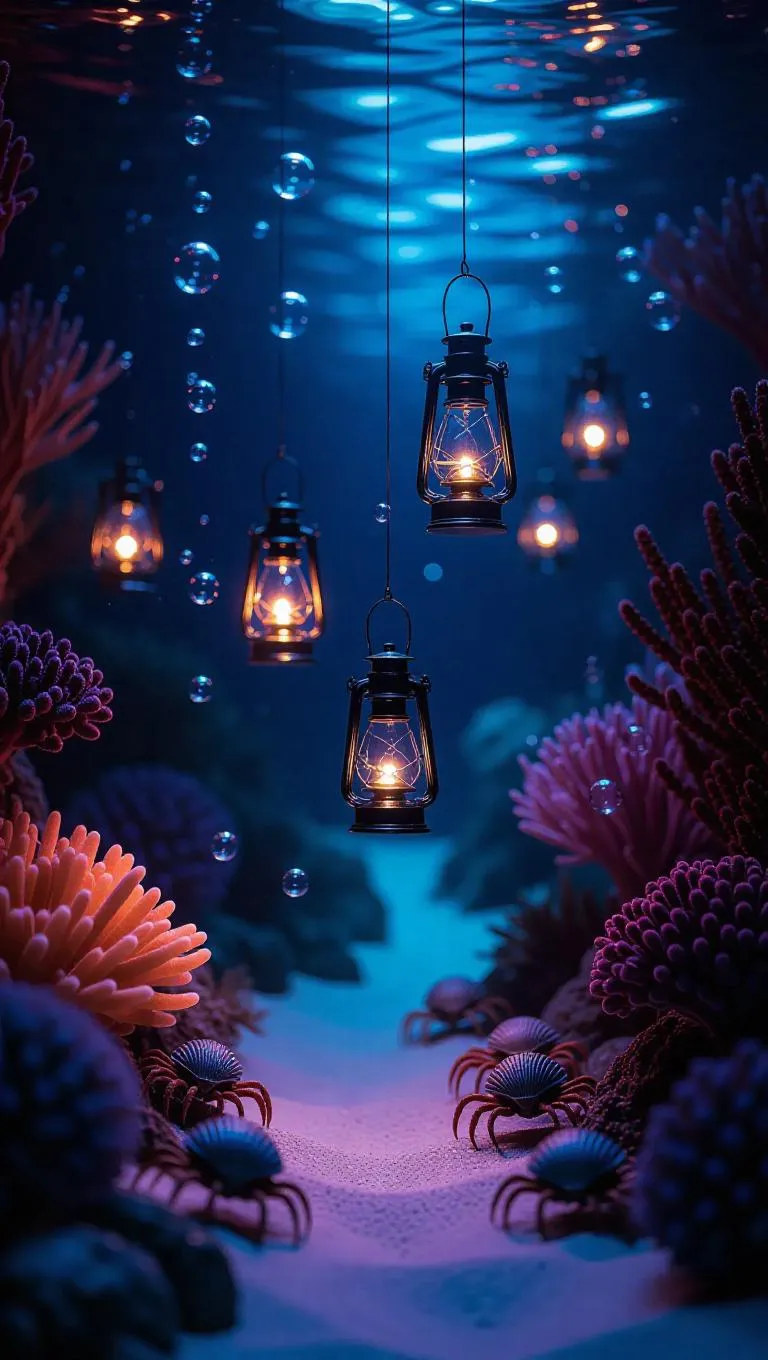 Surreal underwater garden party, radiant lanterns and floating musical instruments, dreamlike colors, weightless atmosphere, ethereal bubbles, soft glowing lights, vibrant coral backdrop, serene and whimsical, surrounded by gentle sea currents, curious hermit crabs crawling around.