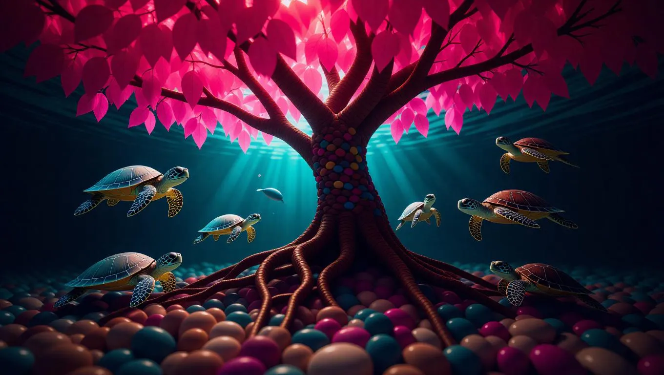 A surreal underwater tree with vibrant pink leaves, roots elegantly entwined with colorful pebbles, softly glowing sea turtles gliding around, bioluminescent creatures dancing in the waves, creating a whimsical, enchanting atmosphere.