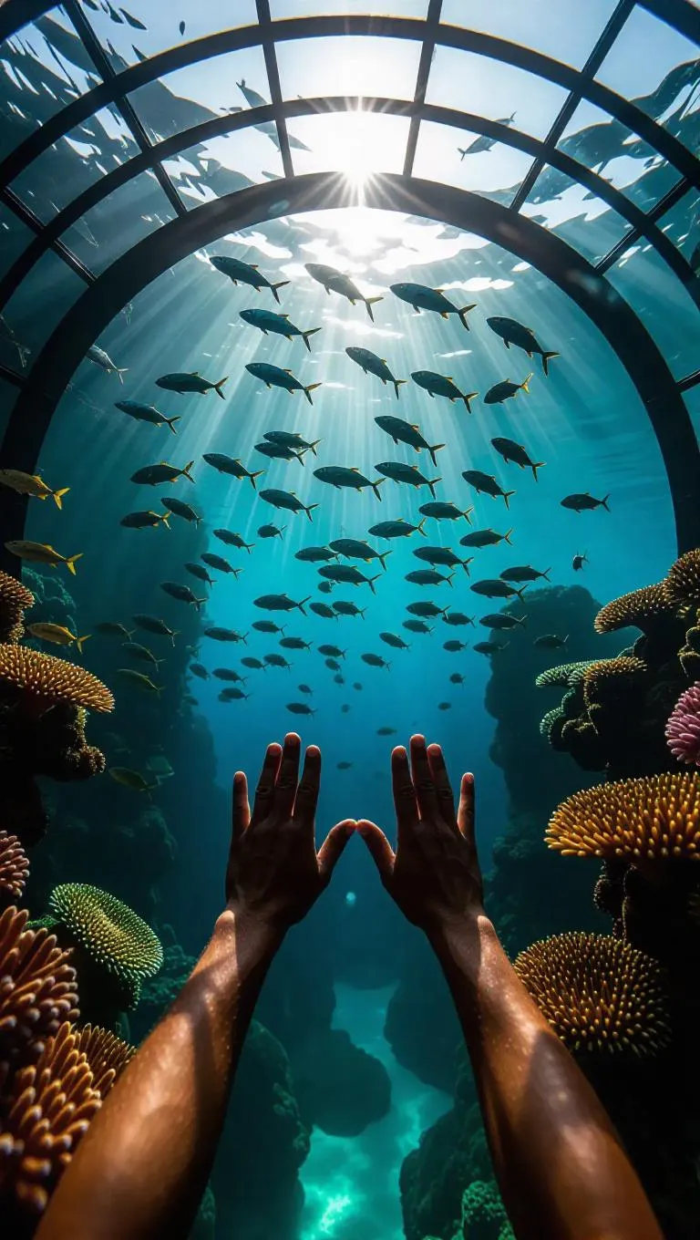Top-down view of ocean adventurer giving fish high-fives near thriving coral reefs, schools of swordfish creating dynamic shapes, beams of sunlight penetrating through a futuristic glass dome, crafting a spectacular underwater tableau.