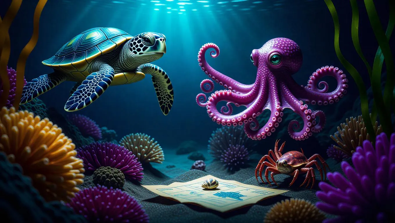 A mysterious underwater detective scene, a brave turtle investigates a missing pearl case, interrogating an evasive octopus and a frantic crab. Clues like fragmented shells and a crumpled map are scattered among vibrant coral and cascading seaweed, creating a suspenseful and intriguing atmosphere.