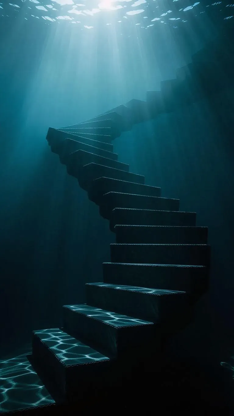 A surreal underwater staircase spiraling upward, enshrouded in misty light, soft lines, mysterious atmosphere, surrounded by faint currents and sparkling water.