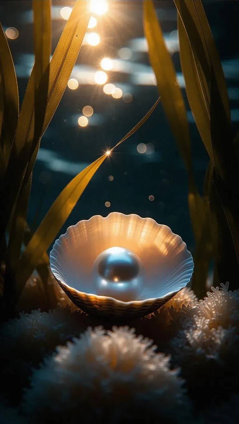 Minimalist underwater scene of a lustrous pearl nestled in an open clam, framed by seaweed and soft, ethereal light reflections, creating a serene and tranquil ambiance.