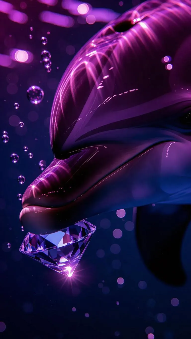 Cinematic close-up of a dolphin's snout softly interacting with a sparkling diamond, dramatic shadows cast by ethereal lavender light, bubbles swirling around, vibrant underwater colors adding depth and texture.