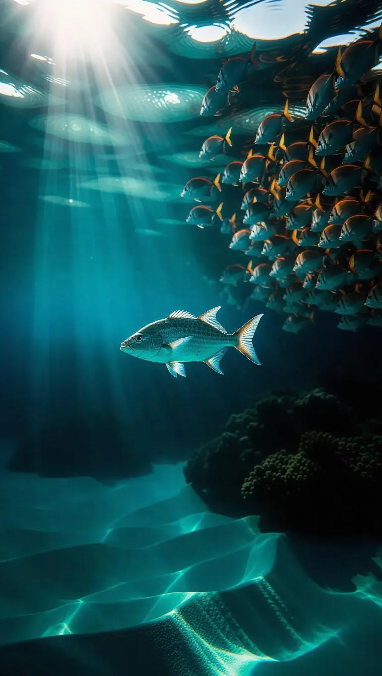 13. Underwater scene, a single triggerfish boldly centered in deep teal waters, surrounded by a school of vibrant fish, soft gradients transitioning from dark to light, clean and elegant lines, ethereal glow, gentle currents, sandbanks in the background, sunlight filtering through the surface.