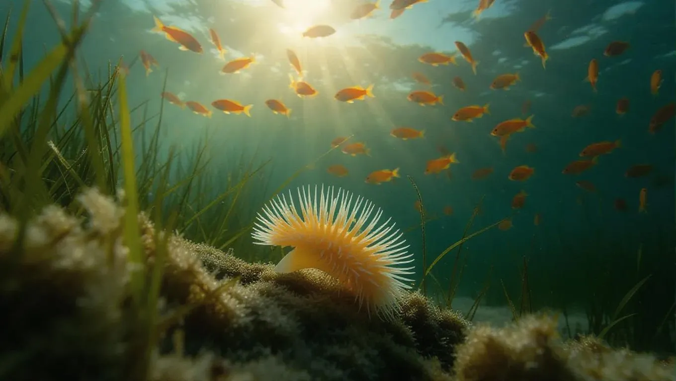 18. Underwater scene, a single nudibranch artistically centered in deep olive waters, surrounded by a school of tiny bright fish, soft gradients transitioning from dark to light, clean and elegant lines, ethereal glow, gentle currents, seagrass beds in the background, sunlight filtering through the surface.