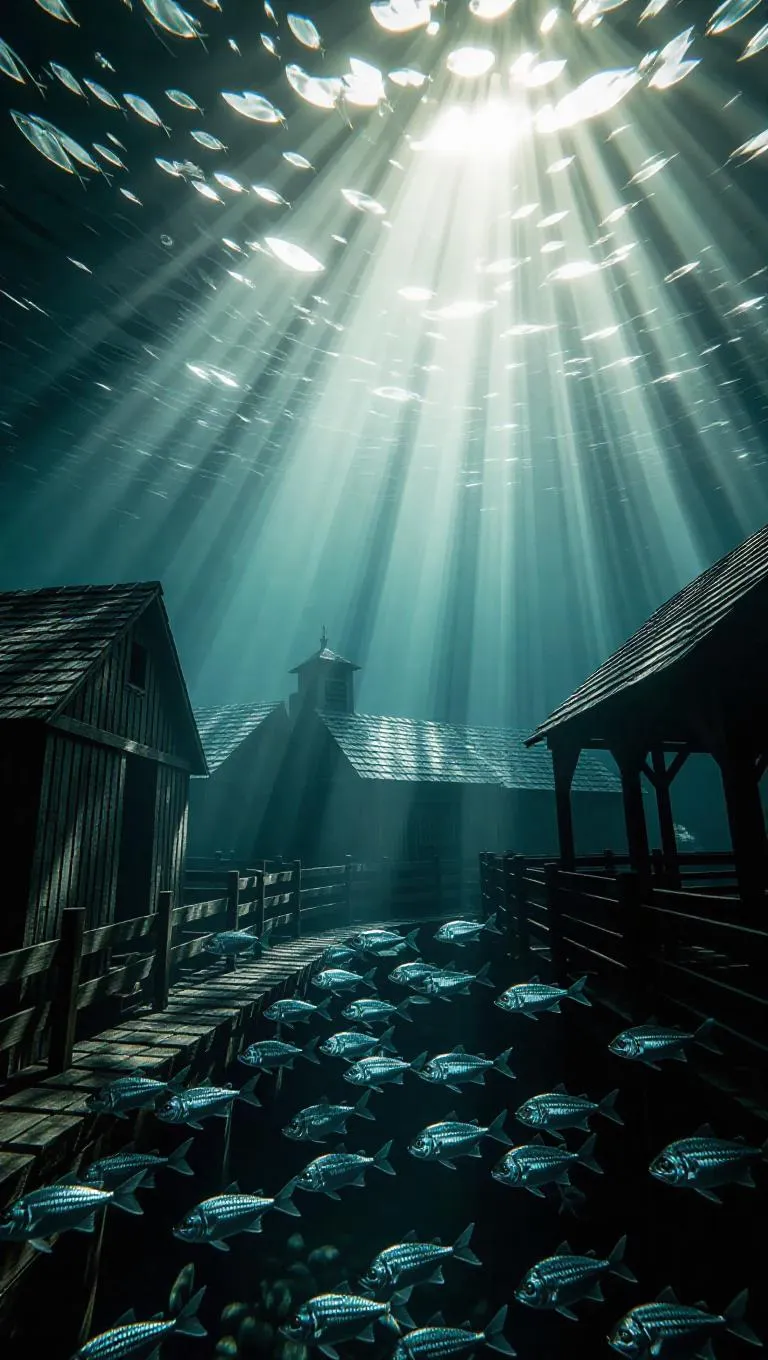 A surreal farmyard scene underwater, with submerged barns and paddocks, beams of radiant sunlight penetrating through the water, creating a serene play of light and shadow, cinematic lighting, highly detailed, surrounded by swirling schools of shimmering silver fish, evoking a dreamlike atmosphere.