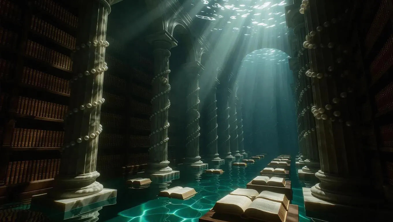 A grand underwater library with alabaster columns embellished with pearl clusters, where manuscripts flutter in the soothing waves. Soft beams shine from the surface above, casting shimmering patterns on dreaming merfolk scholars.