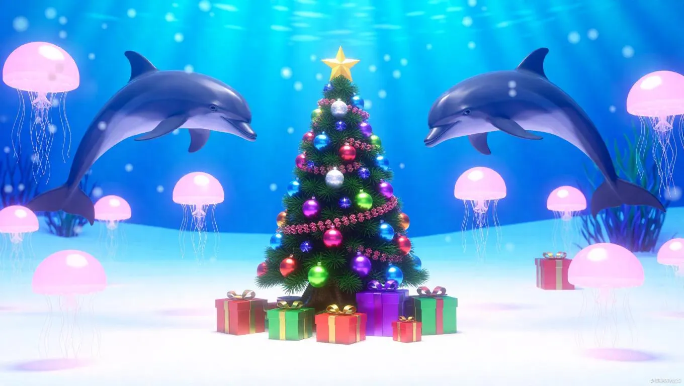 A festive underwater holiday celebration, dolphins adorning a colorful coral Christmas tree, fish exchanging seaweed gifts, jellyfish illuminating the scene with warm bioluminescent glow, snowflakes of bubbles drifting down, creating a dreamy and enchanting atmosphere.