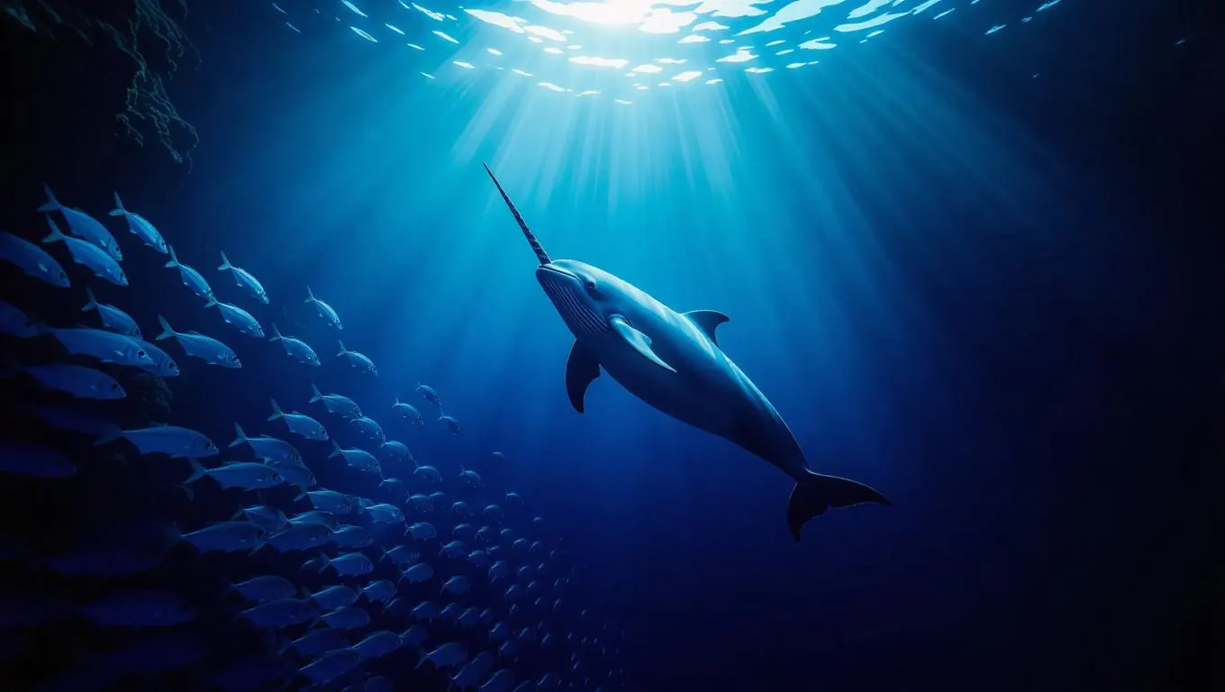5. Underwater scene, a single narwhal majestically centered in deep sapphire waters, surrounded by a school of shimmering fish, soft gradients transitioning from dark to light, clean and elegant lines, ethereal glow, gentle currents, underwater caves in the background, sunlight filtering through the surface.