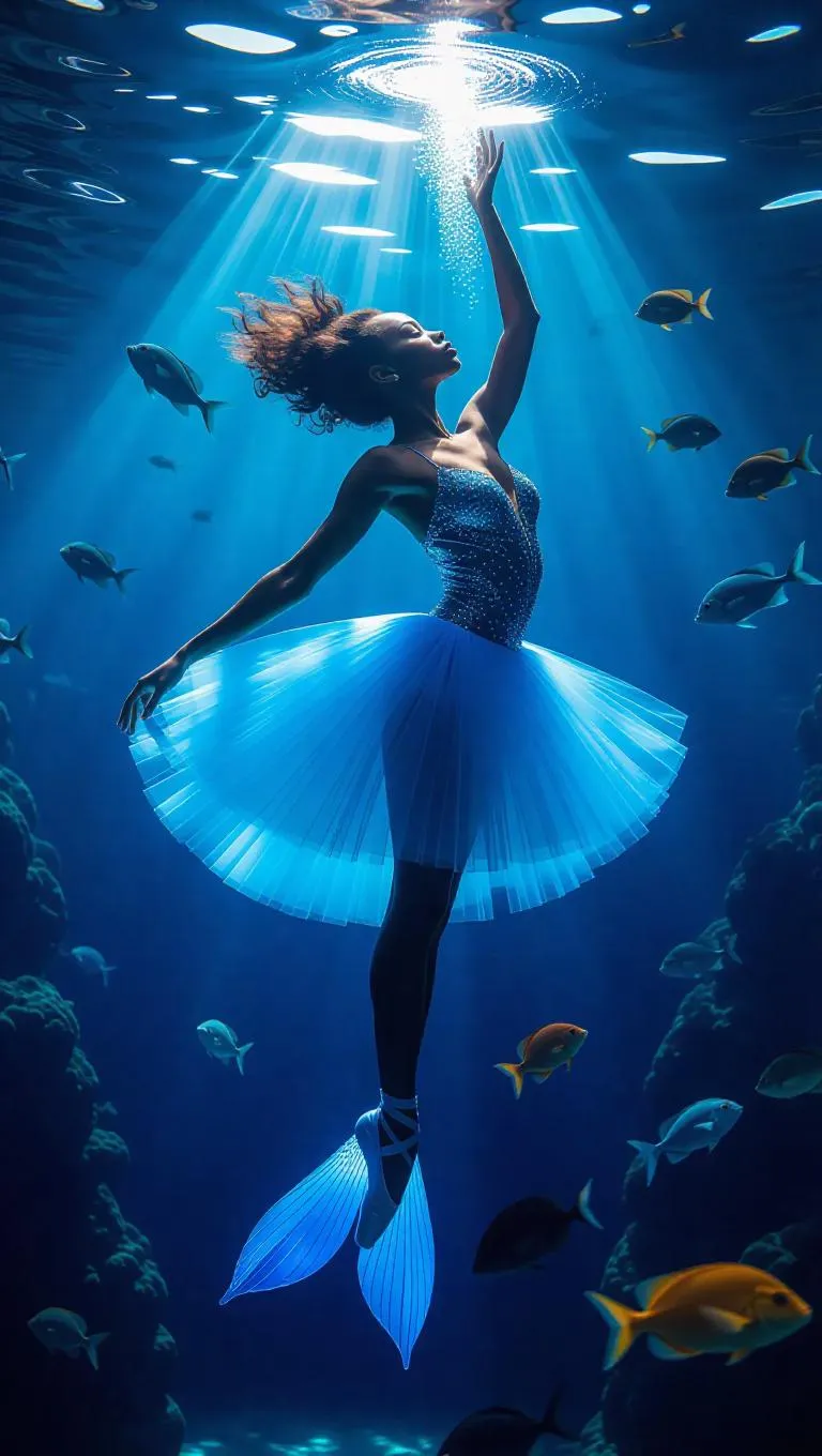 Surreal underwater ballet dancer, composed of shimmering water and radiant light, gracefully gliding through a bold, cobalt sea, surrounded by assorted marine life, creating a mesmerizing dance of colors and motion.