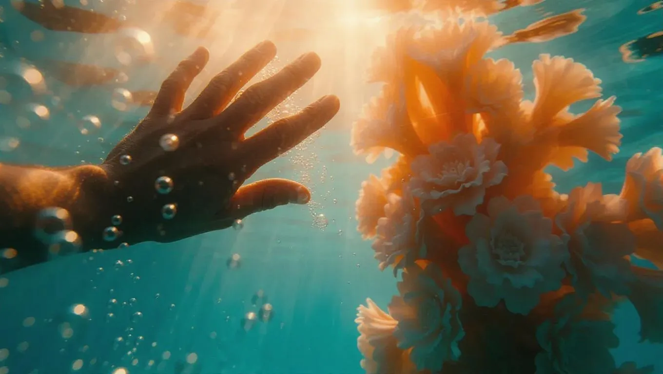 Cinematic close-up of a photographer's hand reaching toward a unique underwater sculpture bathed in light, dramatic shadows, ethereal peach light, bubbles swirling around, underwater art adding depth and texture