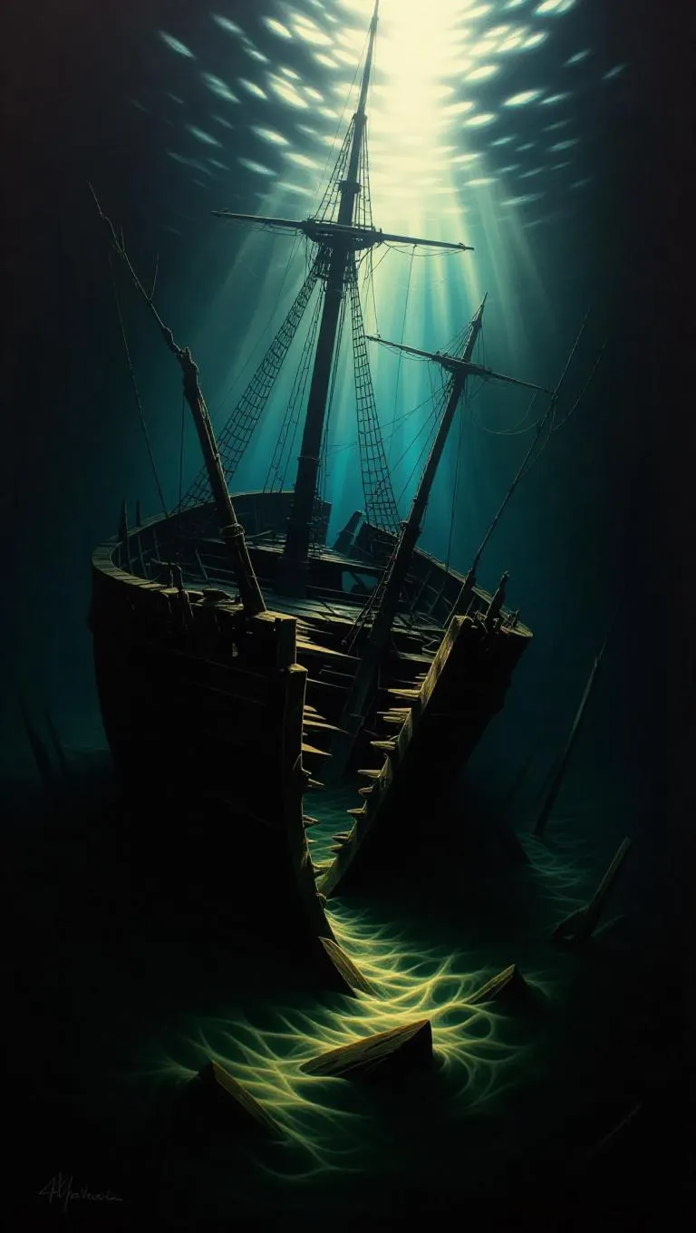 Oil painting of a shipwreck split in two, illuminated by glowing plankton, rich textures, dramatic shadows, and swirling underwater currents, creating a hauntingly beautiful scene.