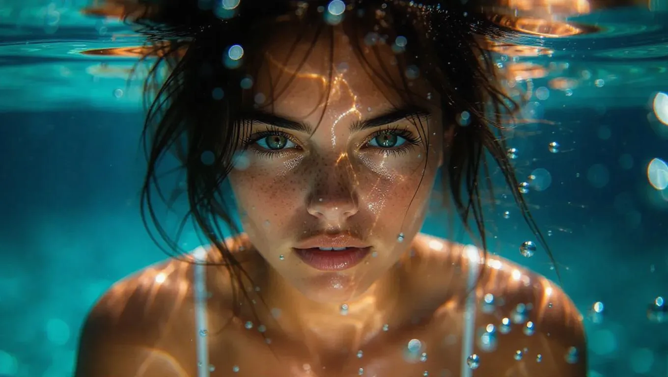 Cinematic underwater portrait of a woman with short hair, ethereal light beams dancing across her skin, intense and focused expression, vibrant bokeh effect, surrounded by swirling currents and glimmering bubbles.