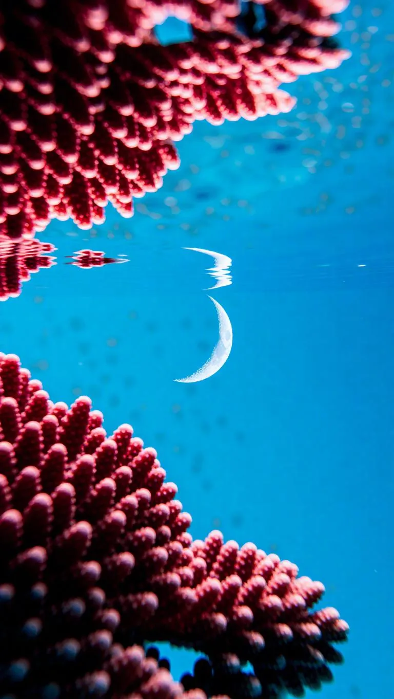 A serene minimal underwater night scene, a slender crescent moon visible through the water's surface, vibrant coral formations rising, creating a tranquil and ethereal atmosphere.