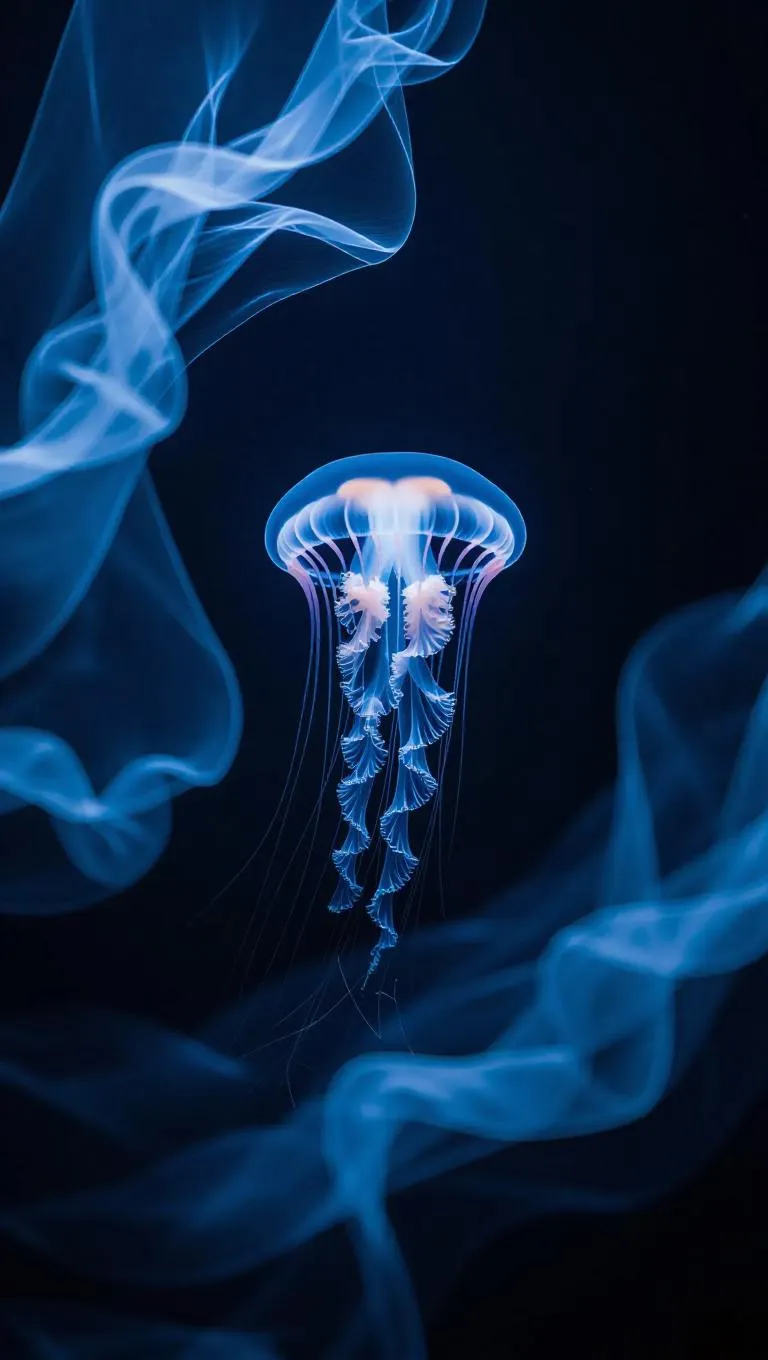 Minimalist underwater scene, a single jellyfish gracefully centered in deep navy waters, soft gradients transitioning from dark to light, clean and elegant lines, ethereal glow.