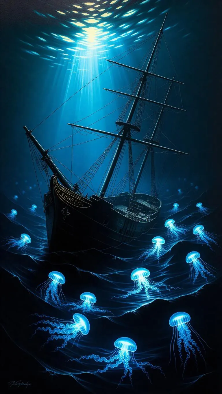 Oil painting of a shipwreck split in two, illuminated by bioluminescent jellyfish, rich textures, dramatic shadows, and swirling underwater currents, creating a hauntingly beautiful scene.