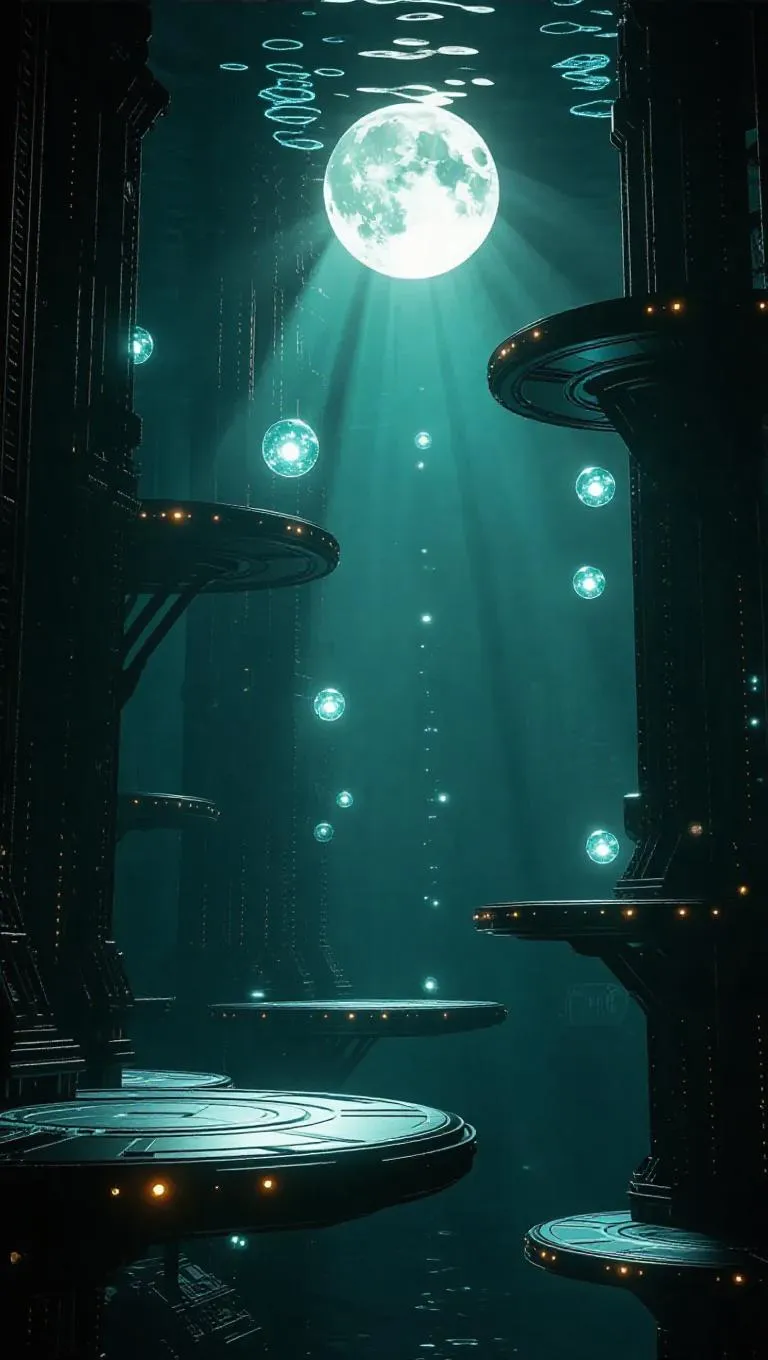 A futuristic scene underwater, showcasing floating platforms and advanced technology, rays of moonlight breaking through the surface, creating a mesmerizing play of light and shadow, enchanting lighting, highly detailed, surrounded by floating luminescent orbs.
