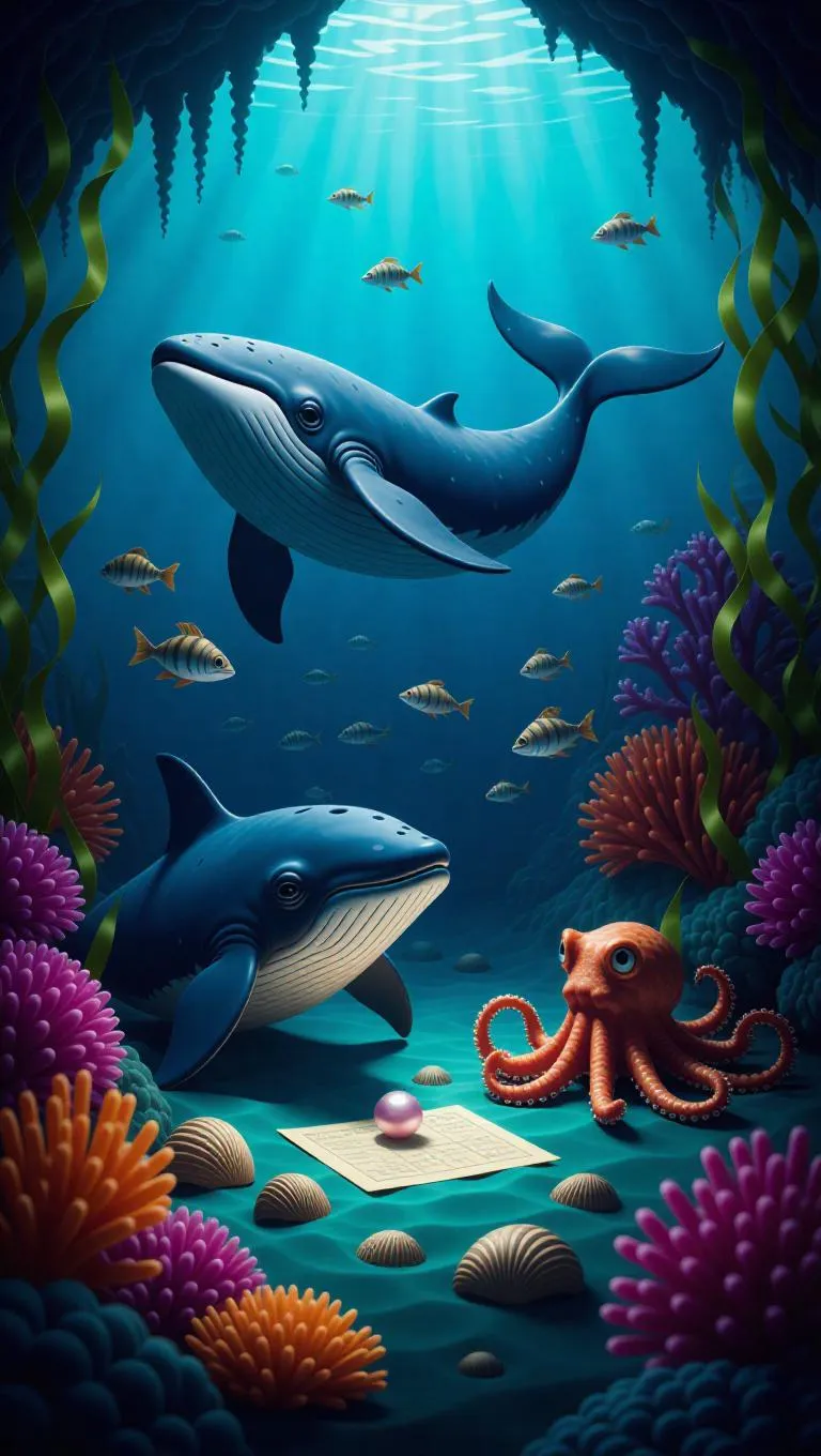 A mysterious underwater detective scene, a perceptive whale investigates a missing pearl case, interrogating a dubious octopus and a twitchy crab. Clues like cracked shells and a tattered map are scattered among vibrant coral and swaying seaweed, creating a suspenseful and intriguing atmosphere.