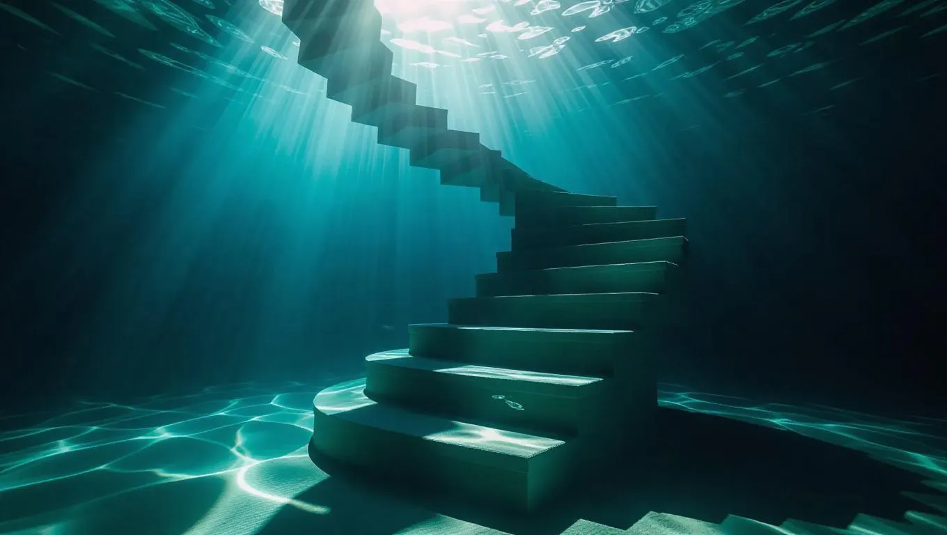 A surreal underwater staircase spiraling upward, bathed in ethereal surface light, clean lines, dreamlike atmosphere, surrounded by gentle currents and shimmering water.