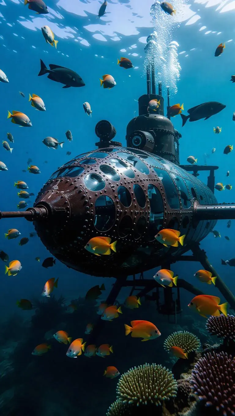 A team of eager underwater engineers constructs a cutting-edge submarine research station on the ocean floor, carefully welding metal beams and installing essential technologies. Colorful fish and inquisitive rays hover nearby, observing their progress in the vibrant marine environment.