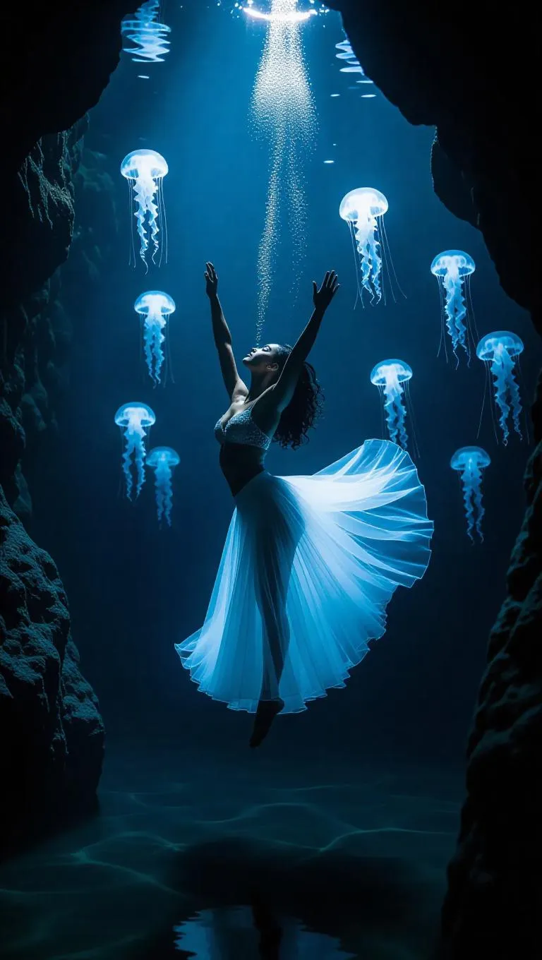An underwater performer executes a mesmerizing routine in a mysterious grotto, their flowing movements synchronized with the deep currents. Jellyfish emit soft, bioluminescent glows in the background, enhancing the enchanting and magical atmosphere.